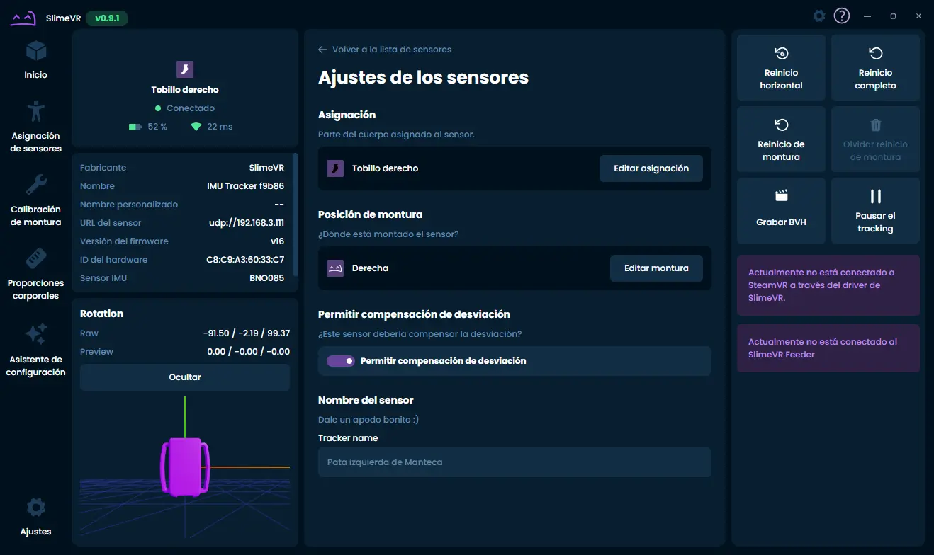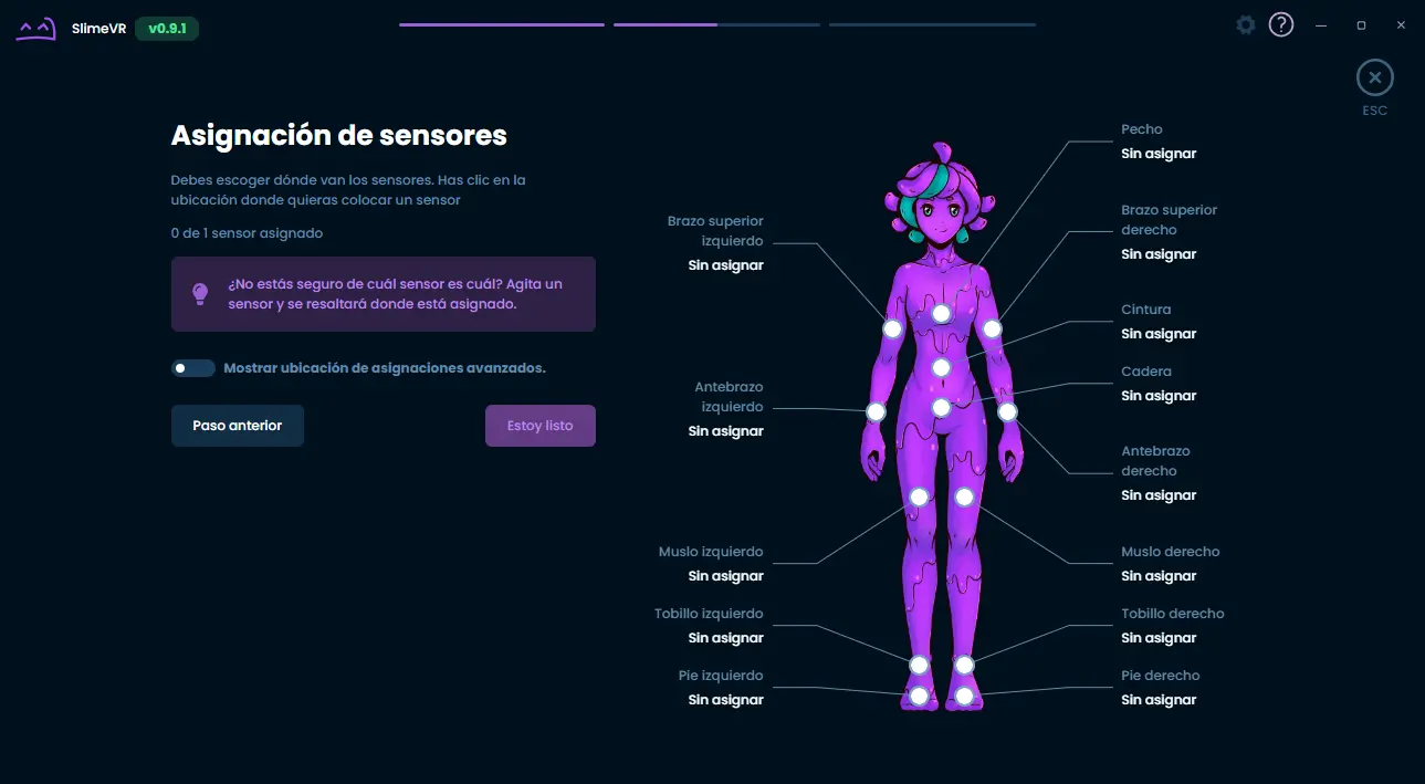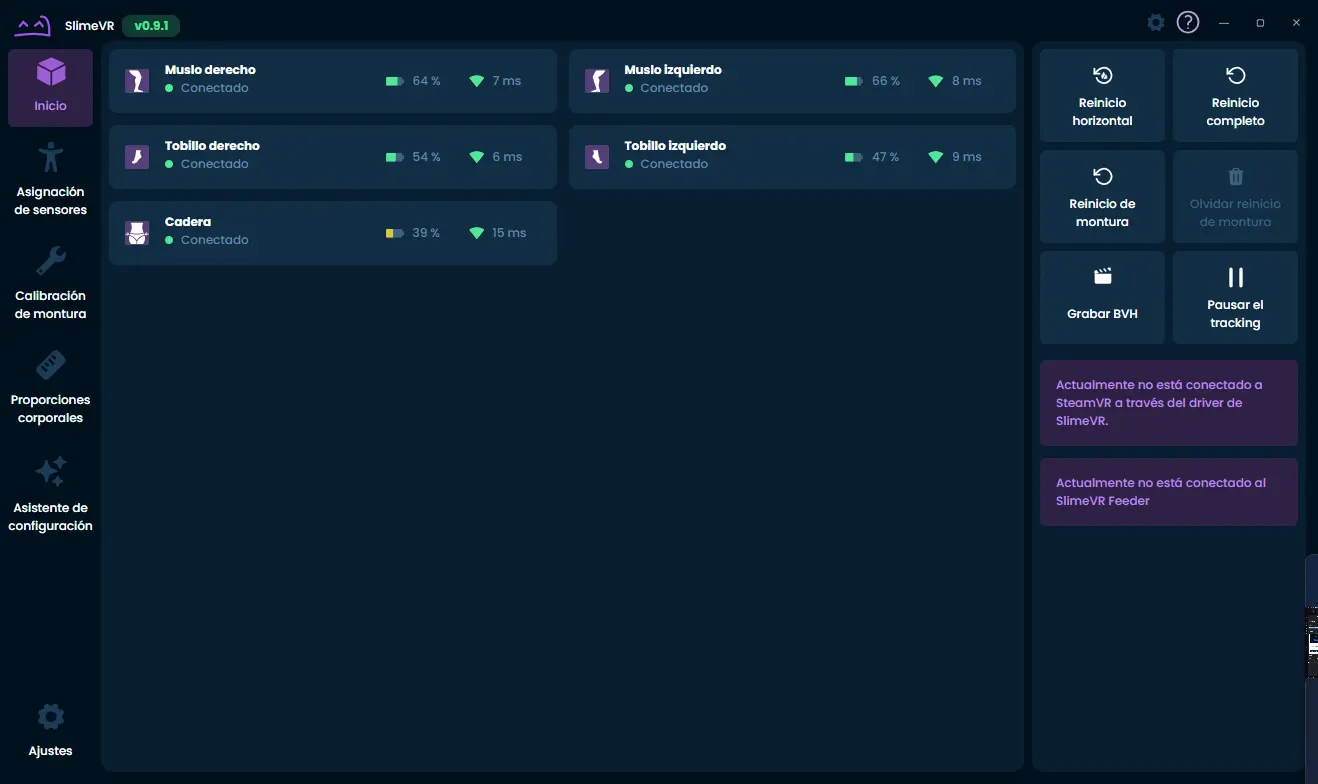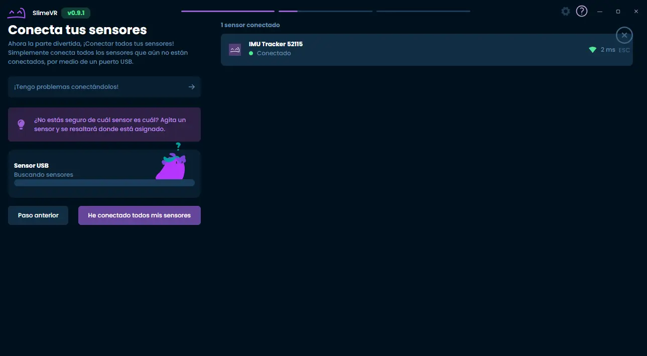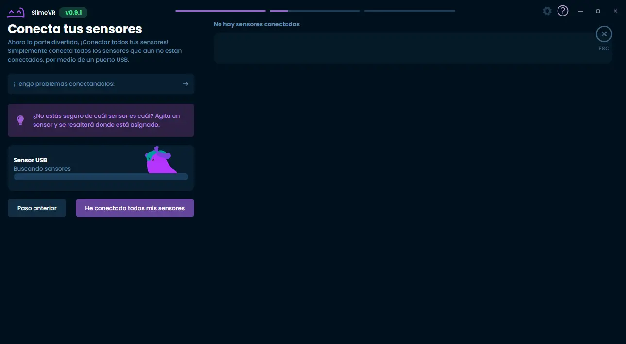 Una vez que tengas conectados todos tus trackers y que funcionen de manera correcta sin estar conectados mediante USB daremos clic al botón de He conectado todos mis sensores para continuar
