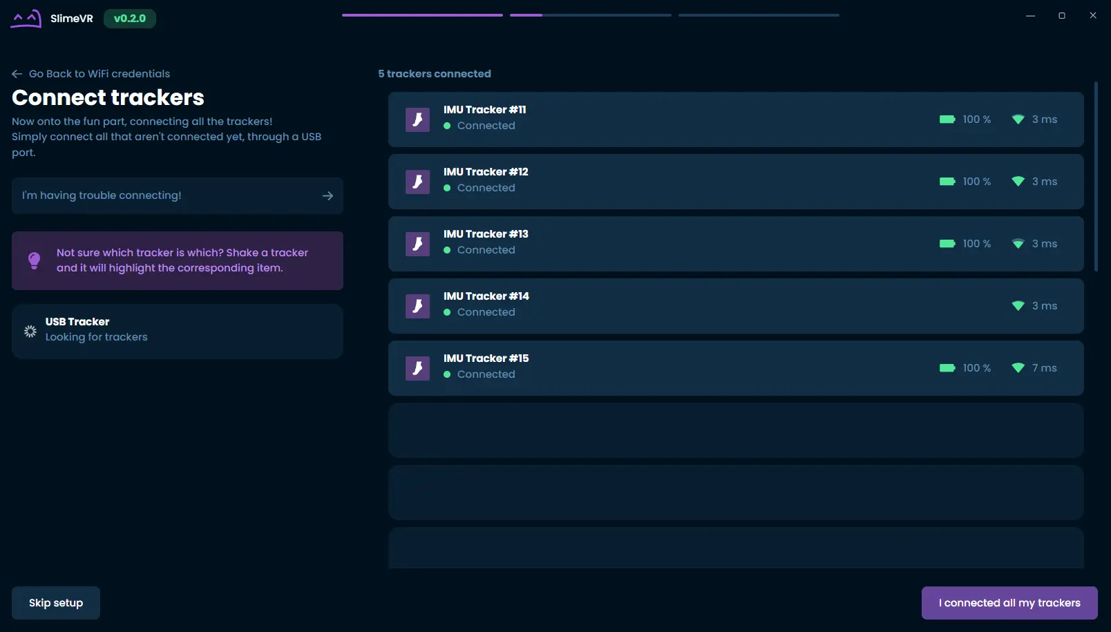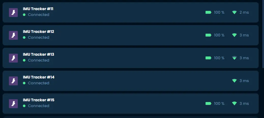 Cuando se detecte el tracker simplemente lo desconectas y conectas el siguiente, y así sucesivamente hasta tener tus 5 trackers conectados, una vez que se configuren puedes encender tus trackers para verificar que los detecte el software, si están conectados por USB no va a salir el porcentaje de batería, una vez que se enciendan y se conecten inalámbricamente se podrá ver el porcentaje de batería del tracker