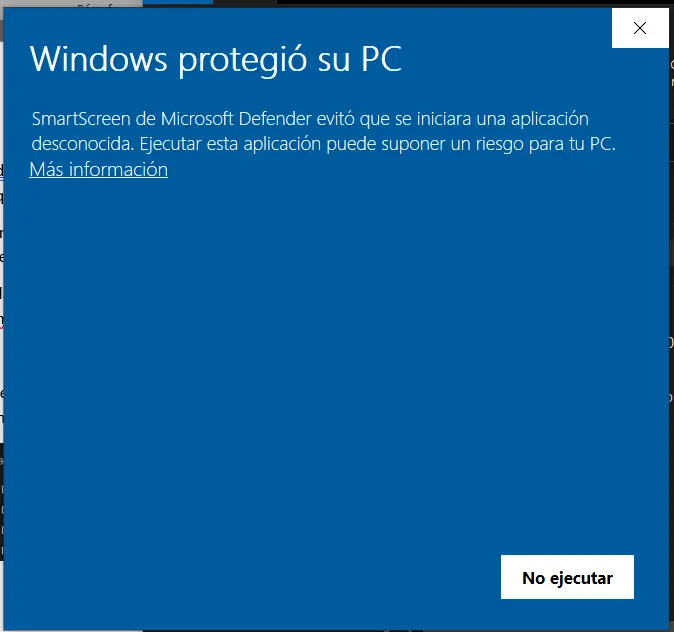No se preocupen, no hay nada que temer al ser un proyecto en desarrollo y al no ser reconocida por Windows lo detecta como malicioso, sin embargo, no lo es, lo único que tendremos que hacer es dar clic en Más información y nos abrirá una opción para ejecutar de tomas formas, tal y como se muestra en la imagen: